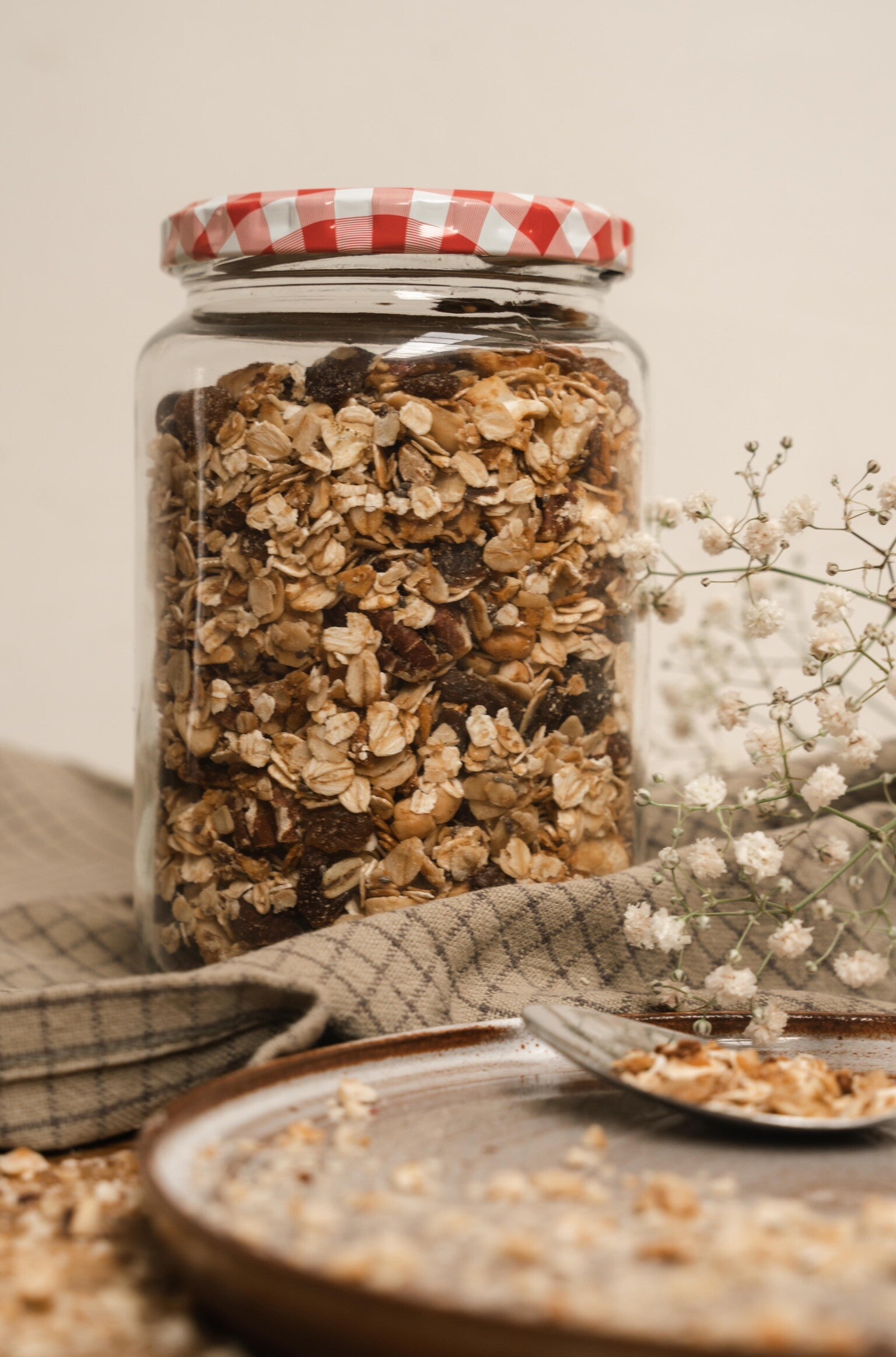 Ingrediënten: bio-havervlokken, bio-havermout, bio-rozijnen, bio-kokosolie, bio-notenmengeling, bio-honing, bio-lijnzaad.